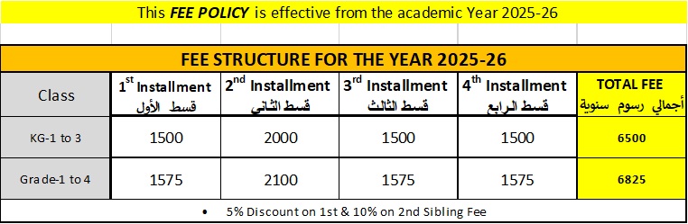 •      Books for Grade 1-3 SR 500/- رسوم الكتب للصفوف من الأول إلى الثالث 500 ريال سعودي